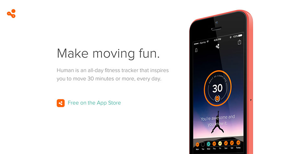 Human是一款能夠跟蹤健身水平、卡路里攝入等的iPhone應(yīng)用。其推廣產(chǎn)品的登陸頁(yè)面在一定程度上采納了蘋(píng)果的設(shè)計(jì)風(fēng)格,使用了大型的文字、大量留白和巨大粗獷的圖片。其簡(jiǎn)約的設(shè)計(jì)一筆到位,沒(méi)有廢話,而且看起來(lái)也很不錯(cuò)。