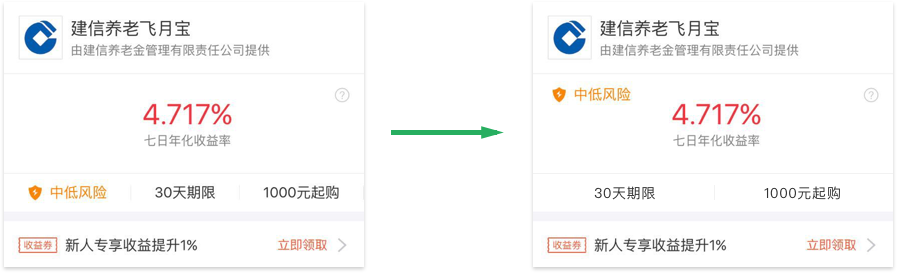 由于中低風(fēng)險(xiǎn)用橙色表示,第一眼會(huì)誤以為“中低風(fēng)險(xiǎn)”、“30天期限”和“1000元起購”是可點(diǎn)擊切換的TAB,而這里“30天期限”和“1000元起購”僅是文字提示。