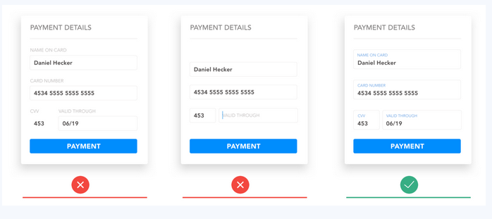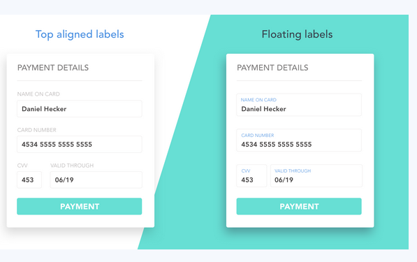 使用第三種模式(浮動標(biāo)簽?zāi)J?檢查用戶輸入是快速且容易的。標(biāo)簽不會消失,也沒有視覺障礙,如頂部對齊的表格。相反,每個字段的一個視覺固定是比較標(biāo)簽和輸入所需要的。