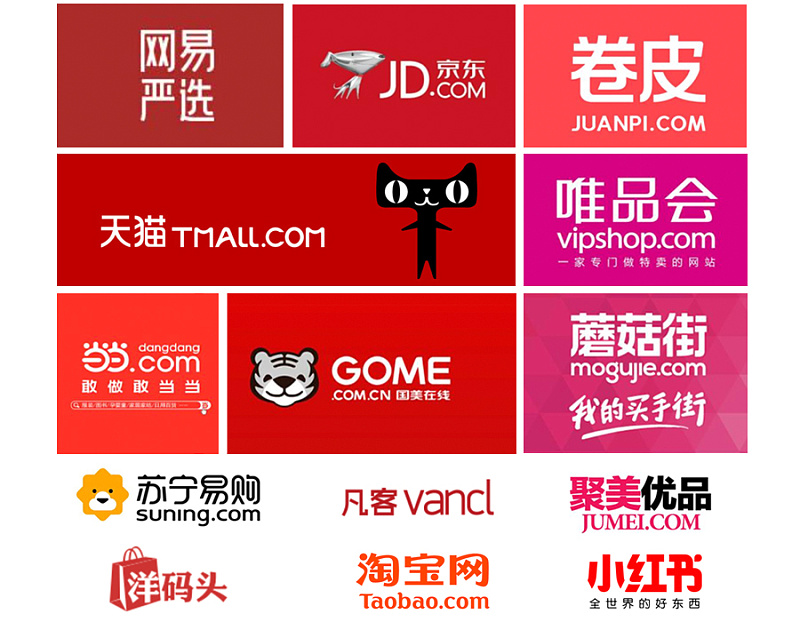 不知道大家有沒有發(fā)現一個規(guī)律和現象,就是國內無論是綜合電商平臺還是垂直型的電商平臺亦或是導購平臺的品牌色一般都是紅色系或暖色系的,而紅色占了大邊天,其次是偏女性化的玫紅色/粉色,再或則是橙色黃色等,我挑選了一些電商平臺的品牌logo給大家看下: