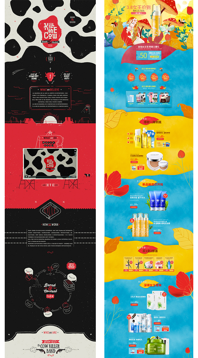 在一些比較俏皮的手繪畫面里,紅色既可以作為大面積背景色來包容五彩斑斕的多彩色,如左邊所示;也可以以非常小面積的點綴色出現,用來突出強調某個重要信息,比如價格啊/利益點啊/特殊說明文字啊之類的。