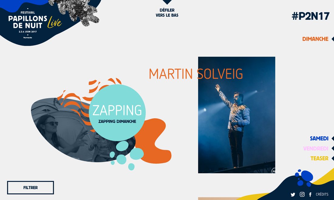 Papillons de Nuit festival 這個(gè)活動主題網(wǎng)站就很好地借助波紋和曲線來強(qiáng)調(diào)。網(wǎng)頁中,基于波紋和曲線所構(gòu)成的元素各司其職,左上角的波紋元素帶有動效,你不會忽略其中所承載的主題,中間多重波紋構(gòu)成的Zapping 元素和矩形的 Martin Solveig 圖片構(gòu)成對比,組成了視覺主體,而右下角流動的波紋則承載著用戶可能感興趣的社交媒體鏈接。