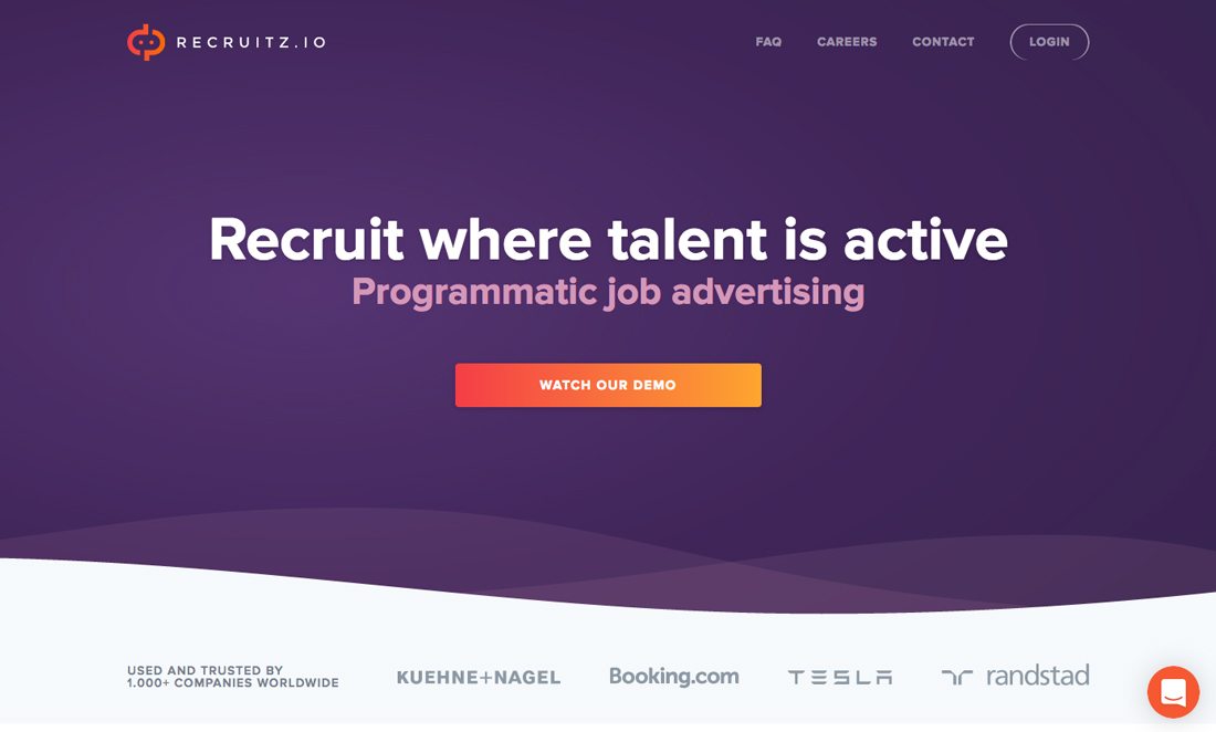 Recruitz 這個(gè)網(wǎng)站就將首屏頂部紫色背景的下邊緣設(shè)計(jì)成為波紋曲線,這種非規(guī)則的視覺元素會讓用戶不自覺地注意到,而又不具備侵略性。多層波紋曲線讓背景擁有了層次,用戶視線自然下探過程中,會不自覺地被漸變橙色的CTA按鈕吸引。當(dāng)然,色彩的選取也起到了一定程度的作用,但是波紋曲線也功不可沒。