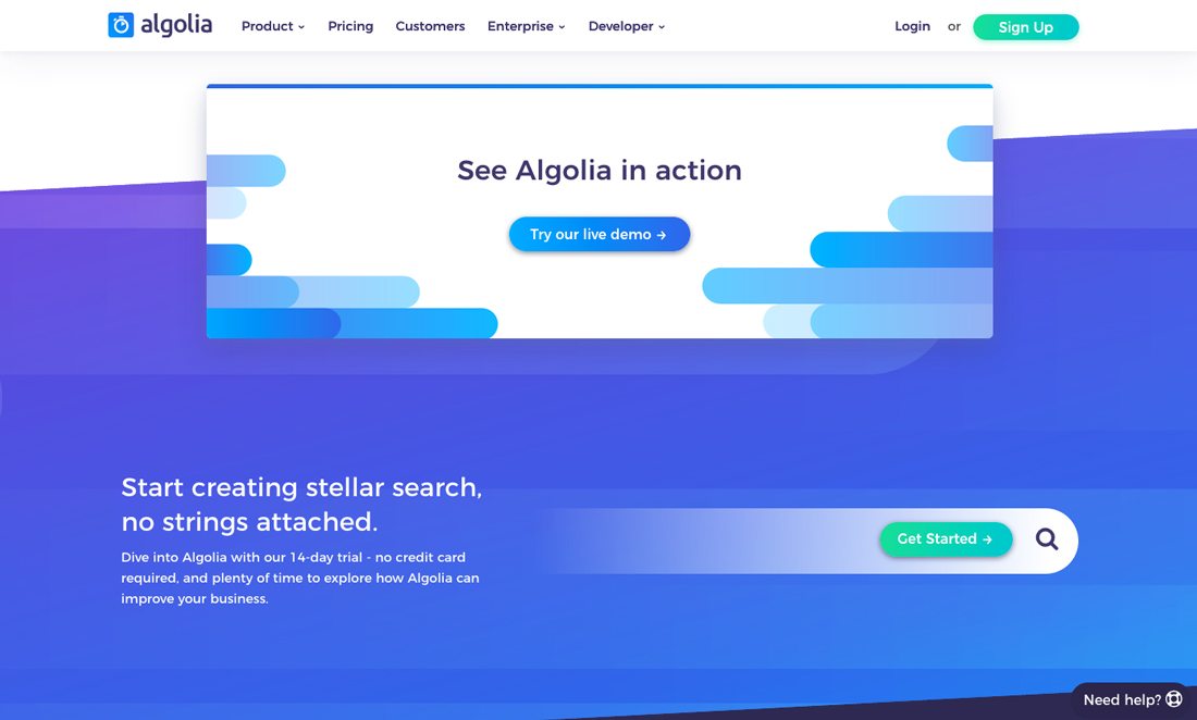 如果將波紋曲線和漸變的技巧結(jié)合起來,運(yùn)用在Material Design 風(fēng)格的頁面背景當(dāng)中,就像 Algolia 這樣設(shè)計(jì),一樣能夠創(chuàng)造出協(xié)調(diào)但是有趣的設(shè)計(jì)。