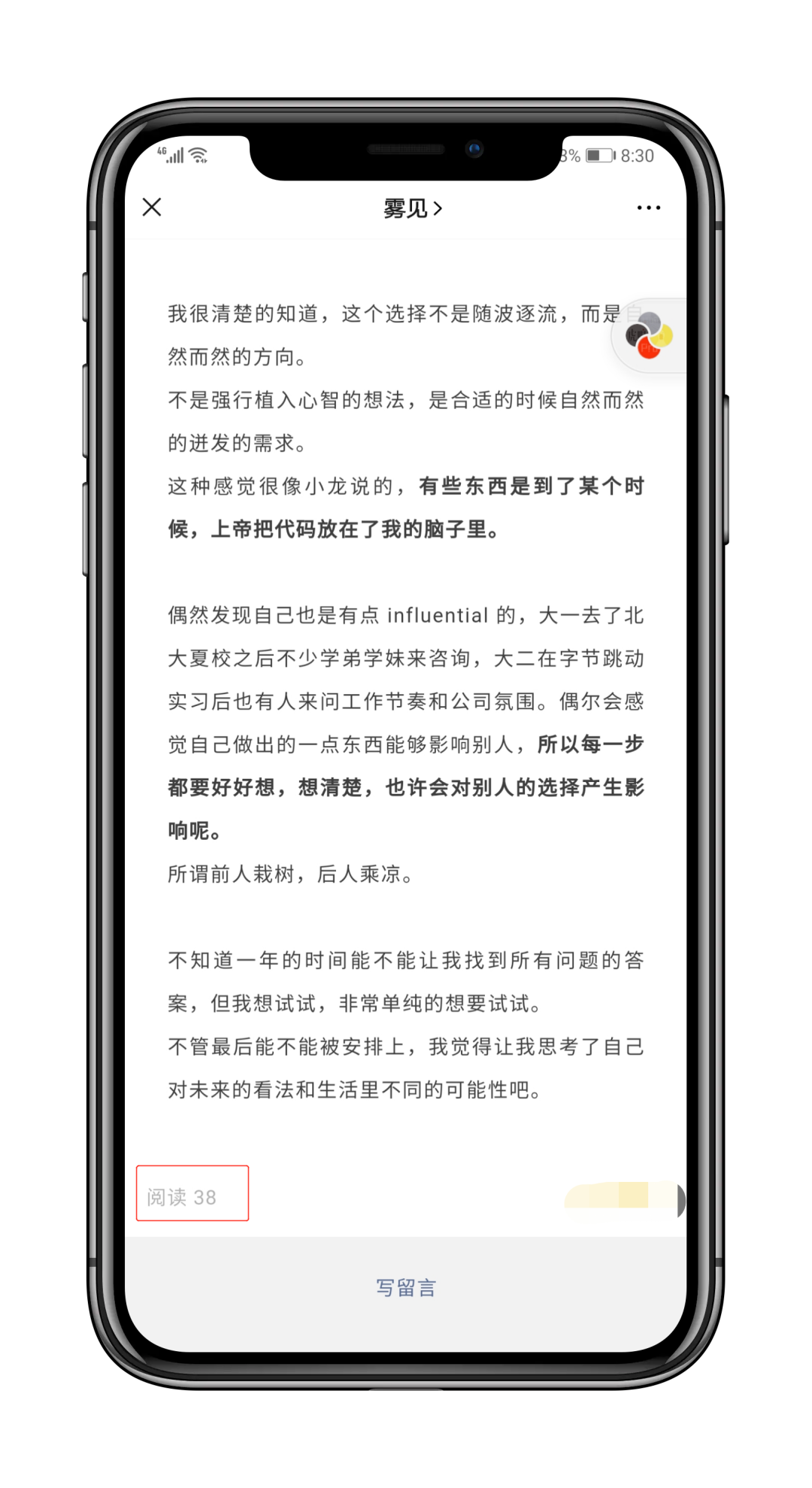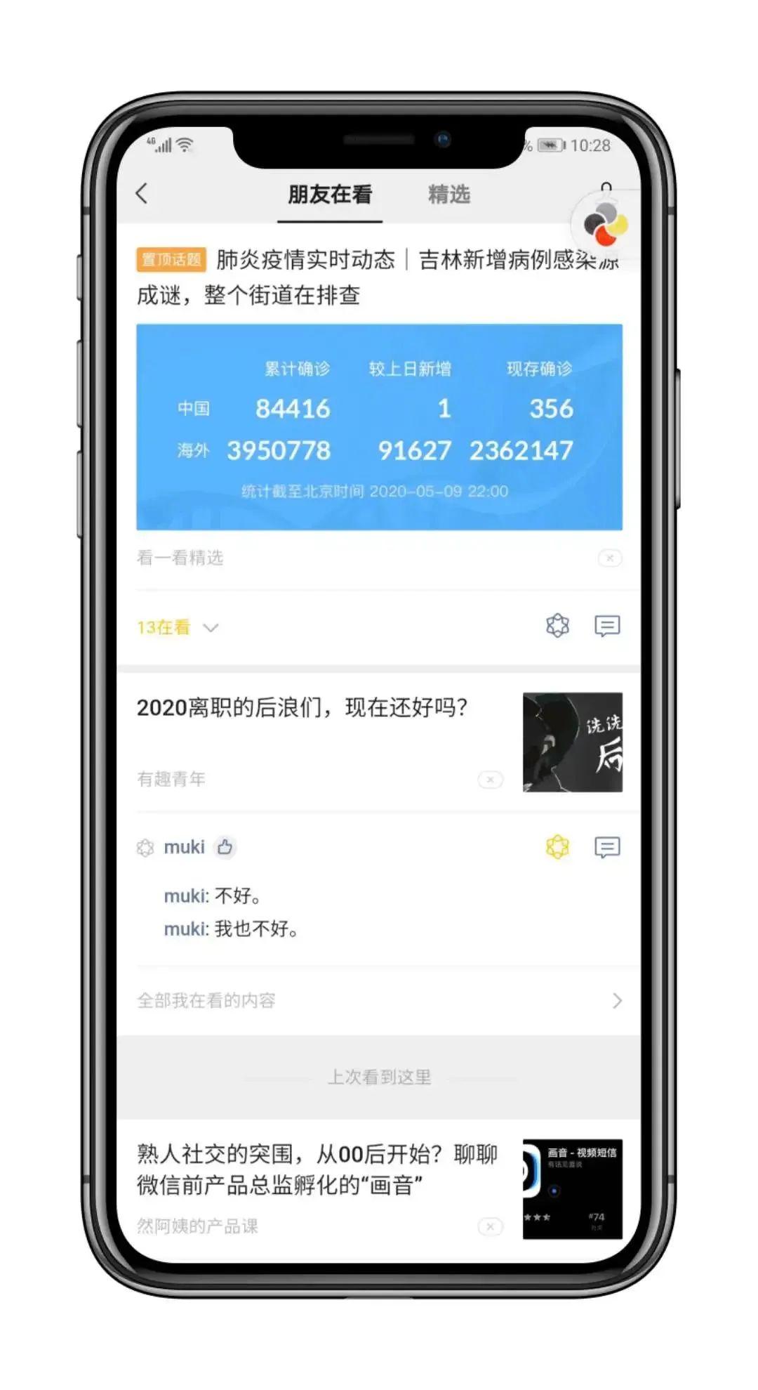 點(diǎn)擊并輸入留言后的文章,以信息流的形式呈現(xiàn)在“朋友在看”默認(rèn)制定精選的下面。出現(xiàn)在第一條可能不是要固定排在精選“看一看”的下面,而是因為這里是上次我瀏覽截止的地方。另外這里還有個小細(xì)節(jié)就是文章那一欄附有一個小小的叉號。