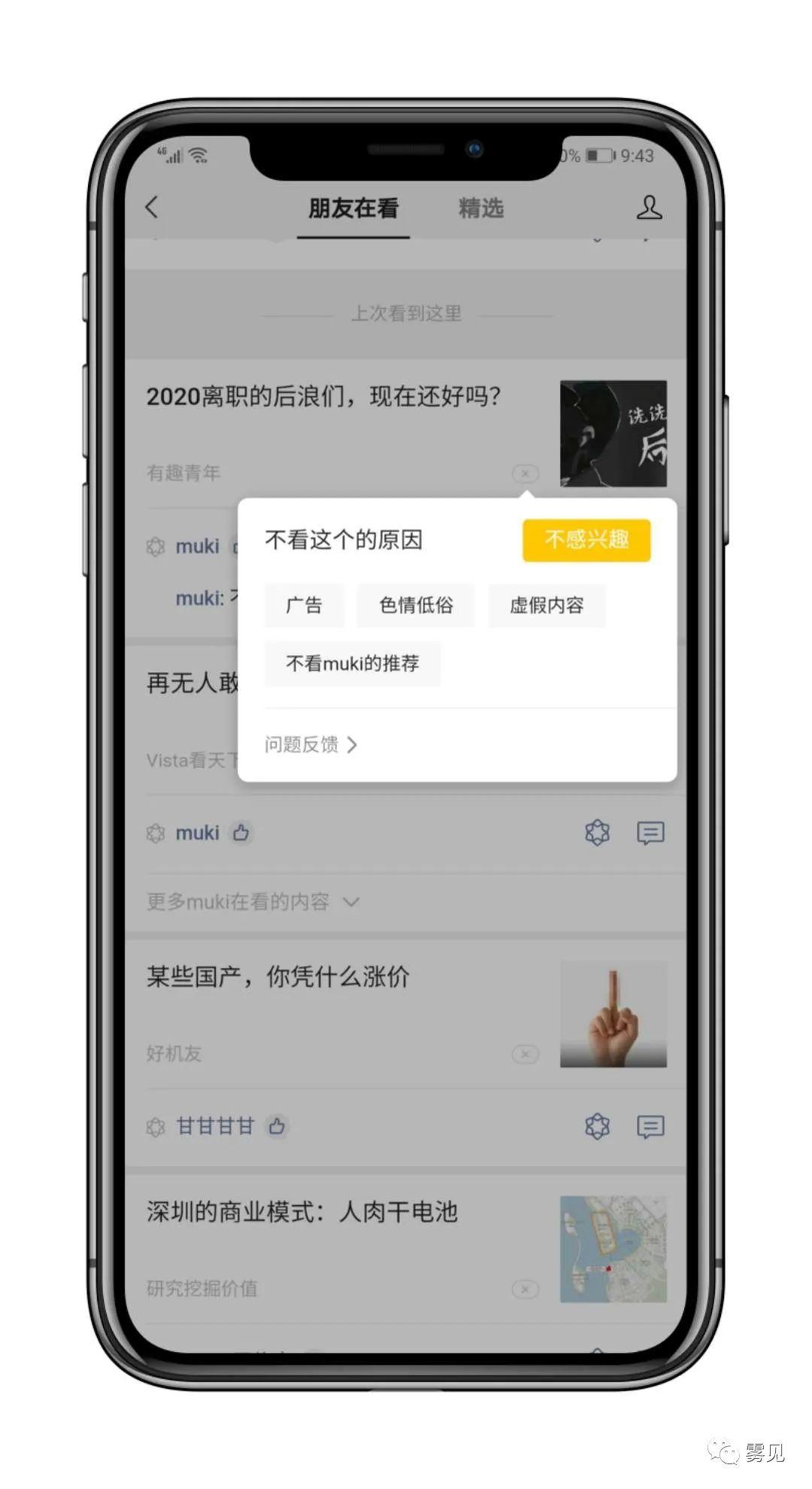 點(diǎn)擊叉號可以除了常規(guī)的舉報,防止微商和廣告泛濫之外,還可以“不看某人的推薦”。