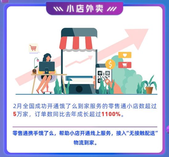 疫情倒逼商業(yè)創(chuàng)新。2月,全國成功開通餓了么到家服務的零售通小店數(shù)超過5萬家,訂單數(shù)同比去年增長超過1100%。