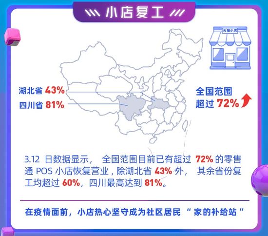 阿里巴巴零售通分布在全國的13萬臺POS數(shù)據(jù)顯示,截至3月12號,全國范圍內(nèi)目前已有超過72% 的零售通POS小店恢復營業(yè), 除湖北省43%外,其余省份復工率均超過60%,四川以高達81%的復工率暫居全國第一。