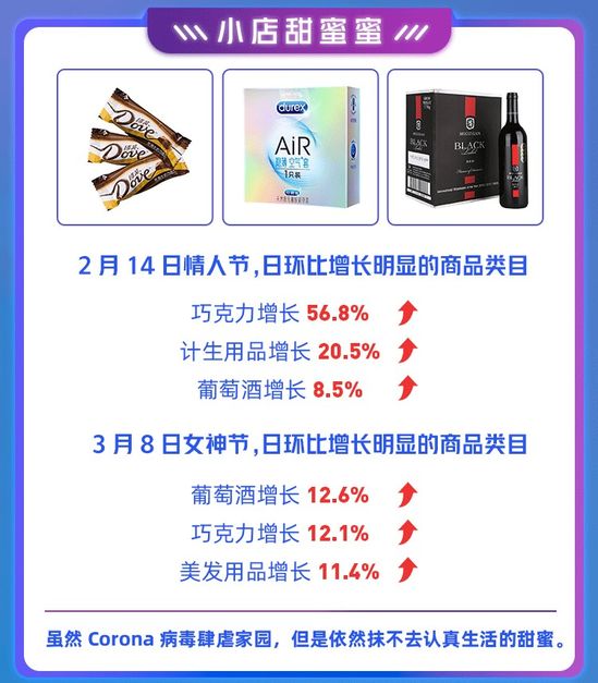 情人節(jié)、女神節(jié)期間,小店“狗糧”類商品均出現(xiàn)增長。2月14日情人節(jié),日環(huán)比增長明顯的商品類目包括:巧克力增長56.8%,計生用品增長20.5%,葡萄酒增長8.5%。