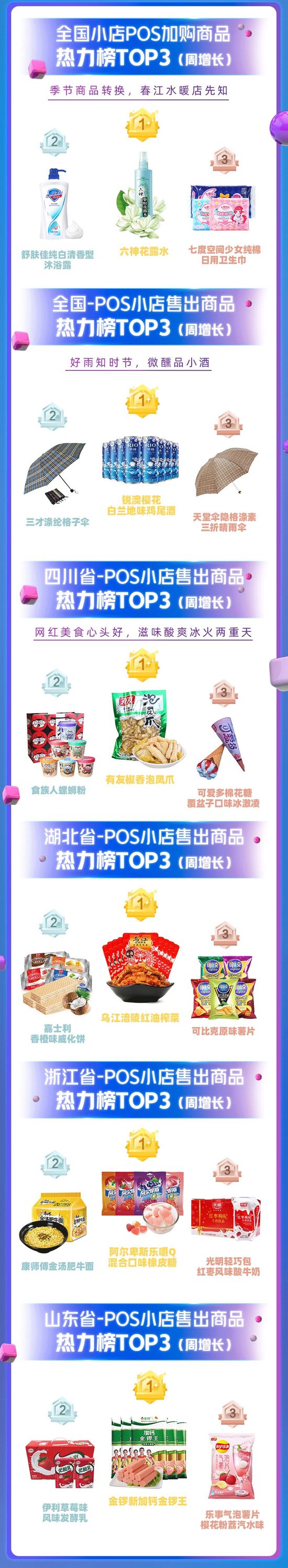通過零售通數(shù)據(jù)可以看到,四川人依舊瘋狂購買著辣味食品,泡椒鳳爪、螺獅粉備受青睞;Q彈果味糖成為浙江小店的寵兒;山東人的美食搭配令人捉摸不透:火腿腸、發(fā)酵乳加薯片;宅家抗疫的湖北人民,泡菜就餅干。