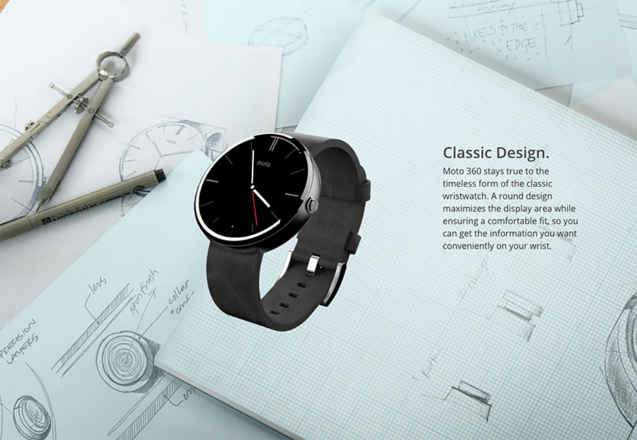 這是摩托羅拉首次殺入智能手表市場,其Moto 360是公司的旗艦產品,因此一定要以一種創(chuàng)新、有趣地方式展示出來。滾動登陸頁你會看到以動態(tài)UI展示的手表裝配過程。其中比較討巧的一個元素,就是手表圖片上顯示的是當前實際的精確時間。