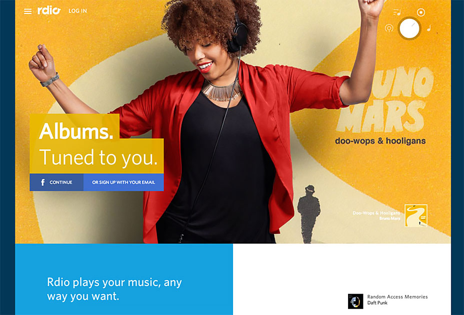 Rdio提供在線音樂服務,其擁有一套制作精良的登陸頁。頁面典雅、簡潔,并采用了大量留白空間和大幅的滿屏圖片,營造出能夠吸引眼球的大膽設計。