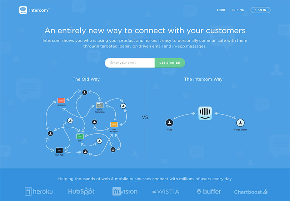 Intercom服務可幫助用戶提高向客戶發(fā)送電子郵件的效率。其登陸頁采用了相對比較復雜的理念以便大家理解產品工作原理以及好處所在。這個設計中我最喜歡的是對比展示舊有工作方式和Intercome的簡便方法。
