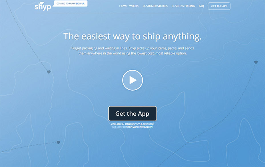 Shyp是一款旨在簡化包裹發(fā)運工作的服務。其流程是首先用手機應用拍攝物品照片,準備發(fā)運,然后Shyp會負責完成剩下全部工作。考慮到這個想法比較不尋常,所以需要比較復雜的解釋工作來展現(xiàn)出這項服務的簡單和直接,而這也就是登陸頁面的作用了。用戶滾動鼠標時,可以看到分步驟的服務流程,并領會到這一切有多簡單和方便。