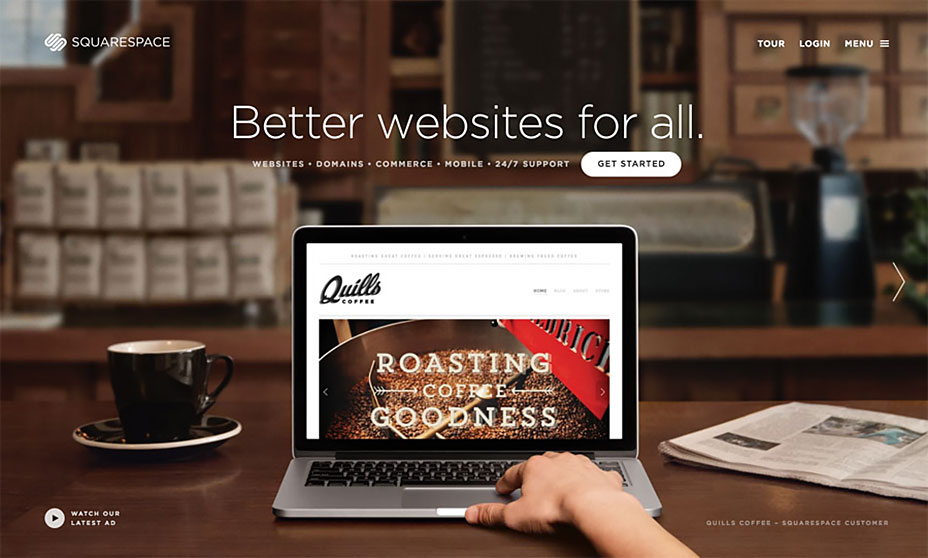 Squarespace網站。其登陸頁面采用了巨幅的背景圖片,動態(tài)展示產品。這一類崇尚簡約的登陸頁面如果安置妥當可以起到很好的作用,而Squarespace則做到了美觀、簡約和好用這三點。