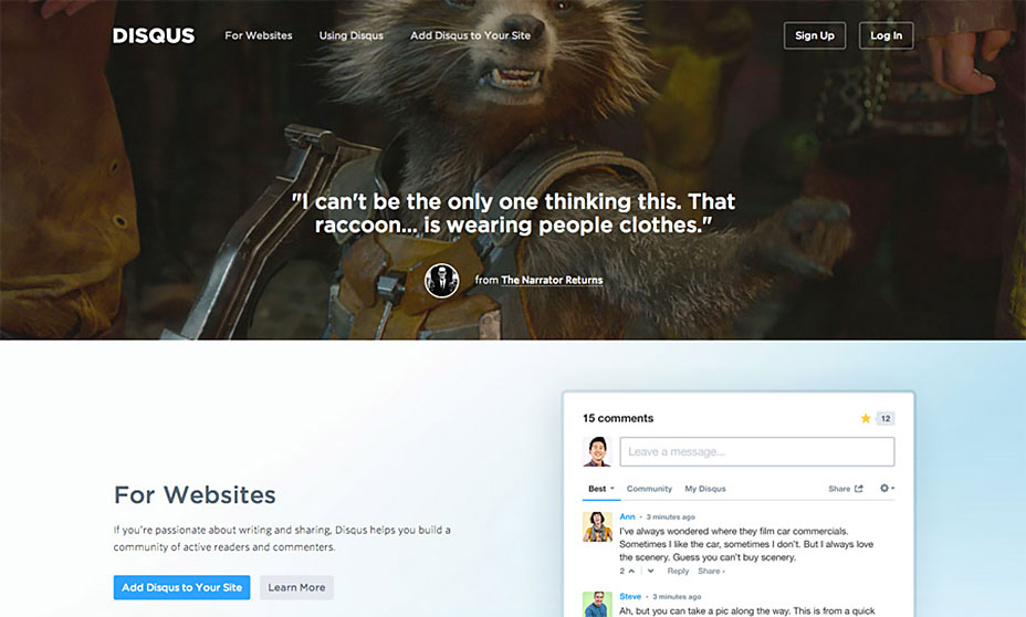 Disqus一直崇尚創(chuàng)意、巧妙并且設計精巧的登陸頁,而其最新的登陸頁版本又加入了一個新元素:個性化。其將主頁的標題部分打造成了一個不同尋常、有趣且好玩的評論幻燈片,給整體設計精美的頁面帶來了另一絲魅力。