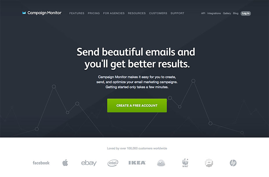 打造簡單雅致的登陸頁面看似簡單做起來難,但是Campaign Monitor出手不凡。這是我印象中最簡單但最漂亮的頁面。其同樣踏中了最正確的節(jié)奏:有力的標題、撰寫得當的介紹語準確說明軟件的好處、顯眼的操作引導以及一片正在使用其軟件的知名公司名稱。