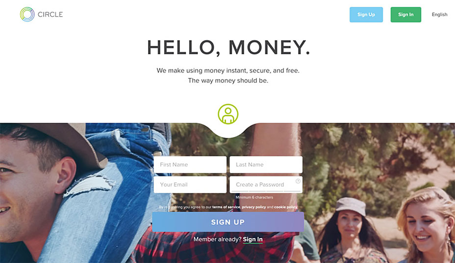 Circle是一項比較新穎的服務,其可輔助你使用比特幣買東西。公司登陸頁面有幾個方面做得非常好,比如在多個位置放置注冊表單,而不是單獨跳出頁面。另外,其還采用了幾個其他設計訣竅。鼠標滾動時,其背景圖片上采用了比較聰明的視差效果,但大型的圖片并不會原地不動,而是會縮小到遠景,營造出不同尋常的運動感。