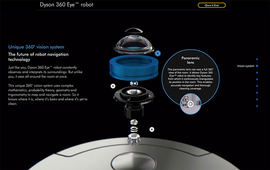 Dyson正式揭開了其機器人吸塵器Dyson 360 Eye的面紗。其登陸頁面采用絕妙而不同尋常的方式展現(xiàn)了其不同尋常的產品。頁面在顯眼位置展示了成品,鼠標滾動采用了有趣的動畫效果展示每個零部件,以便用戶仔細查看吸塵器內部構造。而最后就組成了這一信息滿滿而又十分有趣的產品展示登陸頁面。