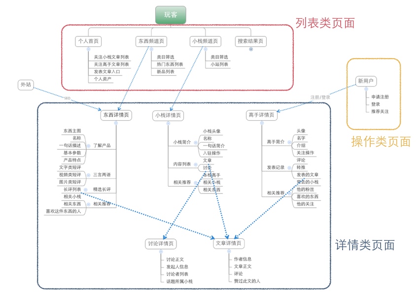 回正題,上一步已經(jīng)把頁面歸類并確定每個(gè)頁面內(nèi)容優(yōu)先級,現(xiàn)在接著分析每種類型頁面的導(dǎo)航、主體內(nèi)容等框架結(jié)構(gòu),最終得出一份框架結(jié)構(gòu)表。從玩客框架結(jié)構(gòu)看出,全局導(dǎo)航是所有頁面公共的,局部導(dǎo)航只有列表類頁面才有,詳情類頁面都有一個(gè)“頁面主人”信息,而關(guān)聯(lián)導(dǎo)航不是每個(gè)頁面都有。