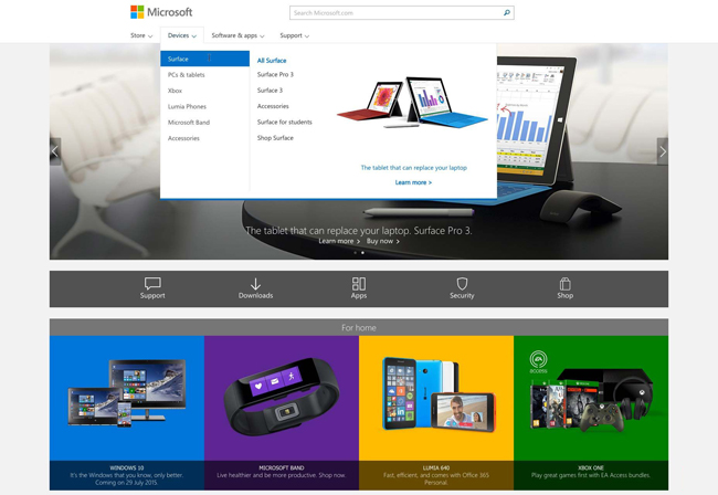 以微軟的首頁為例,網站的導航欄被劃分成四個項目,考慮到微軟龐大的產品線,這幾乎已經被簡化到了極致。也正是因此,每個項目的下拉菜單都被巧妙地分割成為幾段,這樣一來,導航的層級就清晰了,用戶可以更快地找到他們想要的東西,而微軟也可以將復雜多樣的產品和服務,整合到一個看似簡單的導航欄里面。