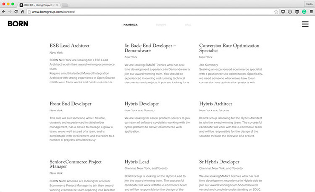 我們想比較兩個(gè)網(wǎng)站。VConcept(上)和Born(下)。VConcept在頁(yè)面上的內(nèi)容更少,但它更難以消化。VConcept頁(yè)面上的所有裝飾都礙事。有一個(gè)三角形圖案背景和一個(gè)移動(dòng)的線背景。該副本有三種不同的樣式――純文本復(fù)制、下劃線和金色下劃線文本。更不用提這個(gè)標(biāo)志也在那一段。只是太多了。另一方面則是出生的職業(yè)頁(yè)面。是的,它有更多的文本,但它是有效的,因?yàn)闆]有裝飾來分散注意力。想象一下,如果這些工作職位是用一個(gè)單一像素的邊界框起來的。信息將很難被掃描。