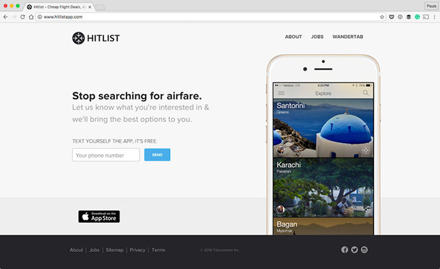 讓我們來看看移動(dòng)旅游應(yīng)用程序Hitlist的登錄頁(yè)面。用戶能做的最明顯的事情就是下載應(yīng)用程序,有幾種不同的方法。用戶可以輸入一個(gè)電話號(hào)碼以獲取文本鏈接或點(diǎn)擊AppStore按鈕。當(dāng)然,用戶也可以點(diǎn)擊其他鏈接。頁(yè)面的主要焦點(diǎn)不會(huì)被其他東西阻塞。