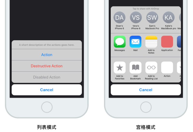 關(guān)閉Action Sheet可以通過點擊“取消”按鈕和空白區(qū)域。Action Sheet以Popover呈現(xiàn)時不需要“取消”按鈕,因為點擊寬廣的空白區(qū)域關(guān)閉更方便。