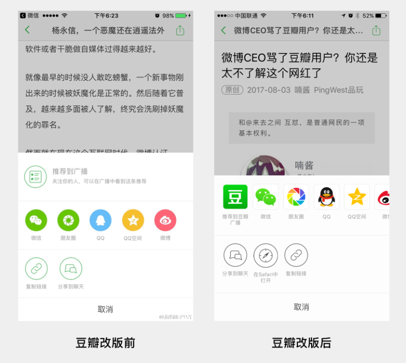 △ 豆瓣App改版前后