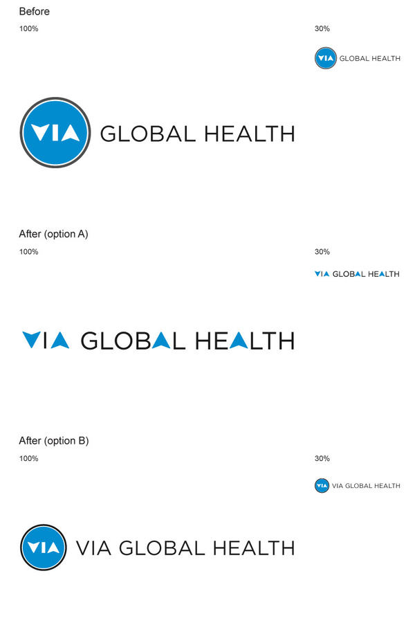 建議一:去掉“VIA”外邊那個圓圈(這個圓圈使“VIA”與其它內(nèi)容分離),并且把“VIA”中“V”與“A”的箭頭同樣應(yīng)用到“GLOBAL HEALTH”中的字母“A”中。