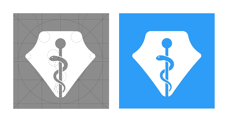 這里優(yōu)化了蛇的形狀,增加了蛇的眼睛,并且讓蛇纏繞蛇杖更緊,提取了鋼筆的頭部元素,設(shè)計(jì)手法是圖標(biāo)的正負(fù)形,利用鋼筆頭鏤空的部分替換成蛇杖,讓兩者結(jié)合起來(lái),圖標(biāo)的背板是用的蘋(píng)果圖標(biāo)規(guī)范來(lái)制作的,圖標(biāo)的設(shè)計(jì)大尺寸1024×1024,設(shè)計(jì)時(shí)必須讓圖標(biāo)的主體在圖標(biāo)規(guī)范的圓圈內(nèi)。