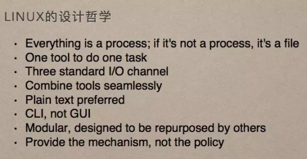 關(guān)于 Linux 的設(shè)計(jì)哲學(xué)很多地方都有介紹,我這里也特意沒有進(jìn)行翻譯,希望大家對(duì)表述中關(guān)鍵的英文單詞也建立起認(rèn)知:
