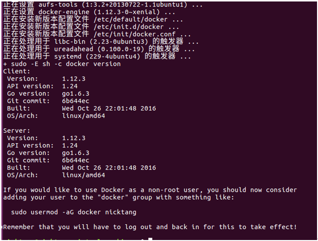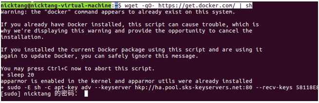nicktang@nicktang-virtual-machine:~$ wget -qO- https://get.docker.com/ | sh