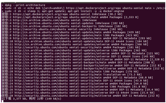 輸入當(dāng)前用戶的密碼后,就會下載腳本并且安裝Docker及依賴包。