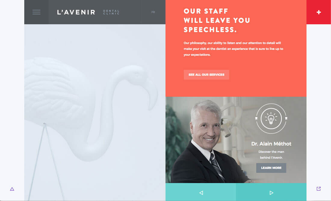 以上面的牙醫(yī)診所的網(wǎng)站為例,整體的設(shè)計(jì)就頗為有趣,親切,且充滿活力。網(wǎng)頁中的人物角色旁邊的燈泡圖標(biāo)中,就加入了牙齒的元素,非常點(diǎn)題。網(wǎng)頁左右側(cè)的色彩對(duì)比也平衡了整體視覺,左側(cè)偏白的部分和白色的圖標(biāo)相互呼應(yīng)。網(wǎng)頁其他的地方也合理地運(yùn)用小圖標(biāo)來強(qiáng)化視覺。