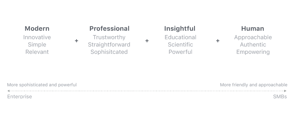 我不知道最終這個(gè)設(shè)計(jì)系統(tǒng)會(huì)是什么樣子,但是我清楚它一定不能太精確,不能限制得過死。它需要是可擴(kuò)展的,靈活的,并且擁有優(yōu)秀的成長(zhǎng)性和可進(jìn)化性。在真正開始視覺設(shè)計(jì)之前,我希望知道我們對(duì)于產(chǎn)品和用戶之間的交互有怎么樣的預(yù)期。我們想到了一系列不同的語(yǔ)匯來對(duì)其進(jìn)行描述,比如人性化、專業(yè)、值得信賴、友善等。