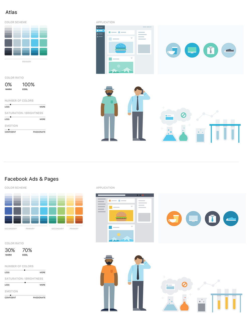 我們通過色調(diào)和色調(diào)之間的協(xié)同來強(qiáng)化 Facebook 的品牌,并且盡力在消費(fèi)者和商業(yè)需求之間創(chuàng)造一致性的特征。在整體方案中,我們盡量讓不同的產(chǎn)品擁有不同的配色方案,創(chuàng)造出讓用戶易于辨別的明顯差異性。