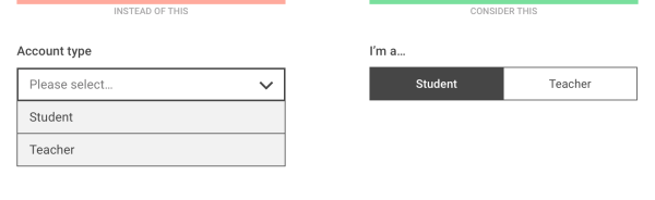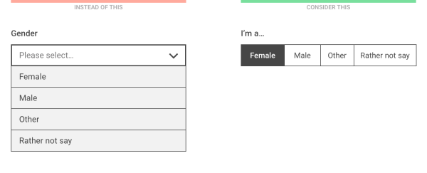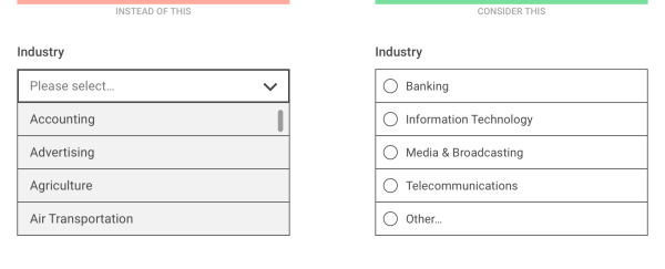 從下拉列表中選擇一個選項,(尤其是在移動設備上)是一個多步驟的過程:你必須點擊下拉菜單打開選項列表,然后滾動和瀏覽項目并選擇一個,然后關(guān)閉下拉。