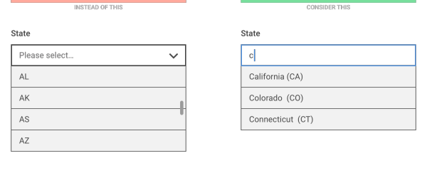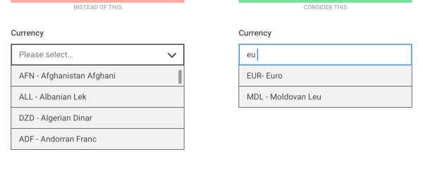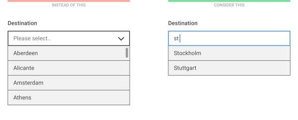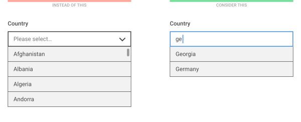 當用戶確切地知道他們在尋找什么時,對于大量確定的選項,考慮使用“請輸入…”這樣的解決方案,其中篩選選項列表在輸入第一個或兩個字母之后顯示。