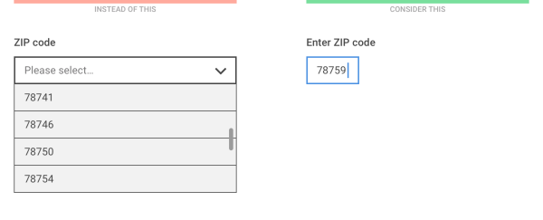 下拉列表的好處之一是用戶不必輸入很多內(nèi)容。然而,如果預期的輸入不是太長并且經(jīng)常被問到(例如個人信息),通常用輸入的方式是比較容易的,而不是從列表中選擇:
