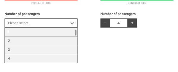 對于表示數(shù)量的謹慎的數(shù)值選擇(例如乘客數(shù)量或購物車中的商品數(shù)量),步進器(stepper)允許用戶點擊來快速增加或減少數(shù)值。