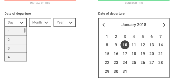 選擇當下最近日期,使用多個選擇菜單選擇可能是一次非常痛苦的體驗,因此我們選擇使用日期選擇器(date picker)。(但千萬別用它輸入出生日期)
