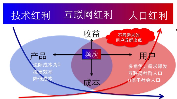 任何商業(yè)模式,或者社會(huì)價(jià)值,都有一個(gè)紅利基礎(chǔ)。我們?cè)谥v互聯(lián)網(wǎng)紅利的時(shí)候,我們分兩部分:技術(shù)的紅利跟人口紅利。技術(shù)的紅利表現(xiàn)為成本越來(lái)越低,人口紅利表現(xiàn)為人的需求爆發(fā)。