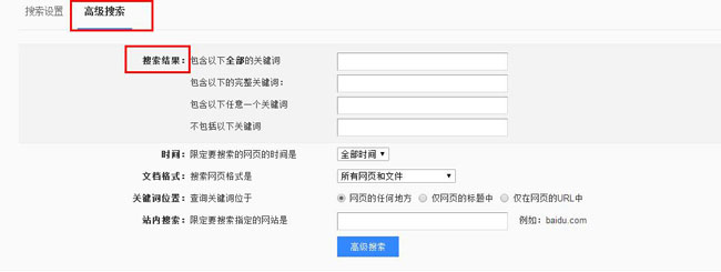在這個面板中我們可以非常便捷地設(shè)置搜索時的過濾條件,包括結(jié)果中要包含什么關(guān)鍵詞詞,要完整包含什么關(guān)鍵詞,過濾掉包含什么關(guān)鍵詞的結(jié)果等等,同時我們還可以通過設(shè)置來限定結(jié)果網(wǎng)頁的時間、關(guān)鍵詞包含的位置、限定站點搜索等等。通過這個面板來使用百度****搜索是最為方便的。