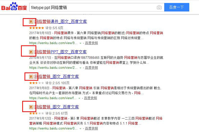 比如搜索“filetype:ppt 網(wǎng)絡(luò)營銷”返回的就是包含網(wǎng)站營銷的ppt文件。只要帶有網(wǎng)絡(luò)營銷兩個字的PPT都被搜索出來。
