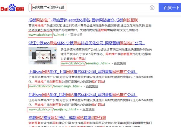 在這里我們可以看到百度自己很大一塊地方,如只想看來自創(chuàng)互聯(lián)的網(wǎng)頁,將其改成了“網(wǎng)站推廣 +創(chuàng)新互聯(lián)”,這個時候百度給我顯示的搜索結(jié)果就變成下面了這樣,搜索結(jié)果變得特別干凈,只有來自創(chuàng)新互聯(lián)網(wǎng)的網(wǎng)頁。