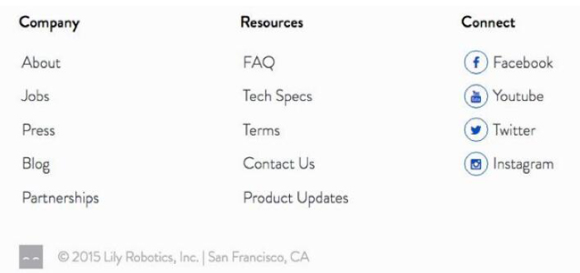 百合相機的網(wǎng)站頁腳具有許多信任信號,所有信息都匯集在一起,以確保潛在客戶和客戶,公司背后是100%的板上。它具有指向其“關(guān)于”頁面,聯(lián)系人電子郵件地址和社交媒體按鈕的鏈接,所有這些都彼此靠近。