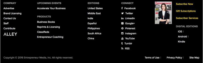 企業(yè)家的網(wǎng)站功能的底部,頁腳的右角的網(wǎng)站地圖。由于黑白色對比,用戶應(yīng)該能夠快速發(fā)現(xiàn)鏈接,盡管它的字體小。