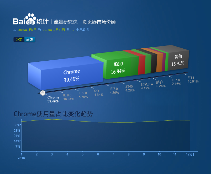 網(wǎng)站設(shè)計(jì)是個(gè)很大的學(xué)問(wèn)。很多朋友以為不了解現(xiàn)今用戶的使用習(xí)慣及使用設(shè)備情況,而導(dǎo)致真多設(shè)計(jì)以不符合使用需求而流失了很多客戶,那么今天創(chuàng)新互聯(lián)就來(lái)給大家分享下,2016整年度的用戶瀏覽器及設(shè)備使用情況。關(guān)于這些市場(chǎng)數(shù)據(jù),不管是產(chǎn)品、策劃、設(shè)計(jì)師,還是前端和開(kāi)發(fā)都是必須了解和掌握的。好吧,接下來(lái)一起看數(shù)據(jù)吧。