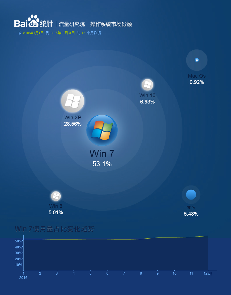 win7其實(shí)真的很好用,小編用過(guò)win10后,因?yàn)楦鞣N問(wèn)題還是將系統(tǒng)重新裝回 win7,而win8一直是個(gè)悲劇,使用效果非常不理想,這小編也是深有體會(huì),那么他占5.01%也屬正常,不過(guò)無(wú)論是win7、win8、還是win10均已能支持IE9以上瀏覽器,說(shuō)明H5時(shí)代已經(jīng)完全開(kāi)啟。